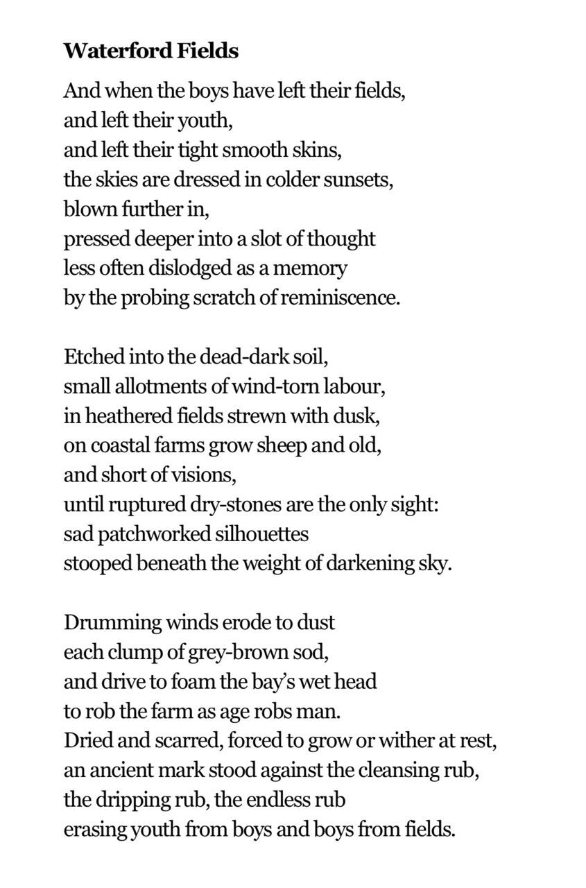 There is a vibrant and multifaceted arts scene throughout Co. Waterford, with many disciplines and many disciples. There is no border between East and West Waterford! Poets may move freely, and often do. There is, however, a major conurbation clustered in the East (a City indeed) which due to its density of population, number of venues, and frequency of events, tends (quite rightly) to attract a lot more attention and exposure than the sleepy goings-on in the West.The sun rises for us all, but it lingers with the West Waterford Poets just that little bit later. Out of respect for their sundowning soliloquys, evening elegies, and late night laconics, this unofficial directory of unsung bards lists writers of poems who are (or have been, or have expressed a desire to be) associated with the warm and wild West of Ireland's only County Waterford.