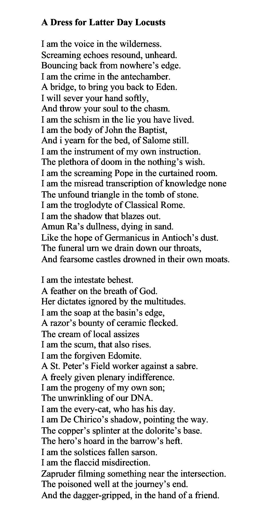 Brief BiographyWriting seriously for 10 years, David is drawn to history, politics, and social injustice.His abiding philosophy is the ethos of Punk.David has been published in numerous magazines and journals throughout Europe, and recently had a script produced for a short Radio Play, "What Kind of Blue?".He also writes songs, and is a gifted visual artist producing collages.
